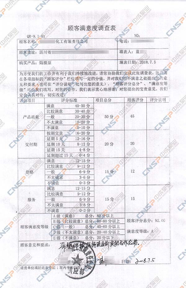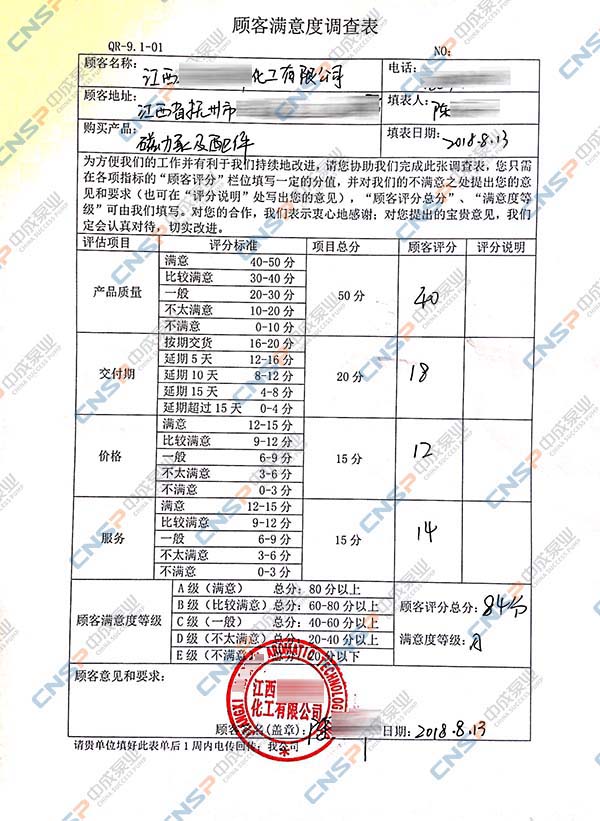 中成泵業(yè)從我們的多級泵、計量泵等產(chǎn)品的客戶中抽選幾名進行表格內(nèi)容調(diào)查,客戶反饋成績均為A級,其中螺桿泵、磁力泵、隔膜泵等客戶紛紛表示希望保持合作并對我們的產(chǎn)品持有期望。